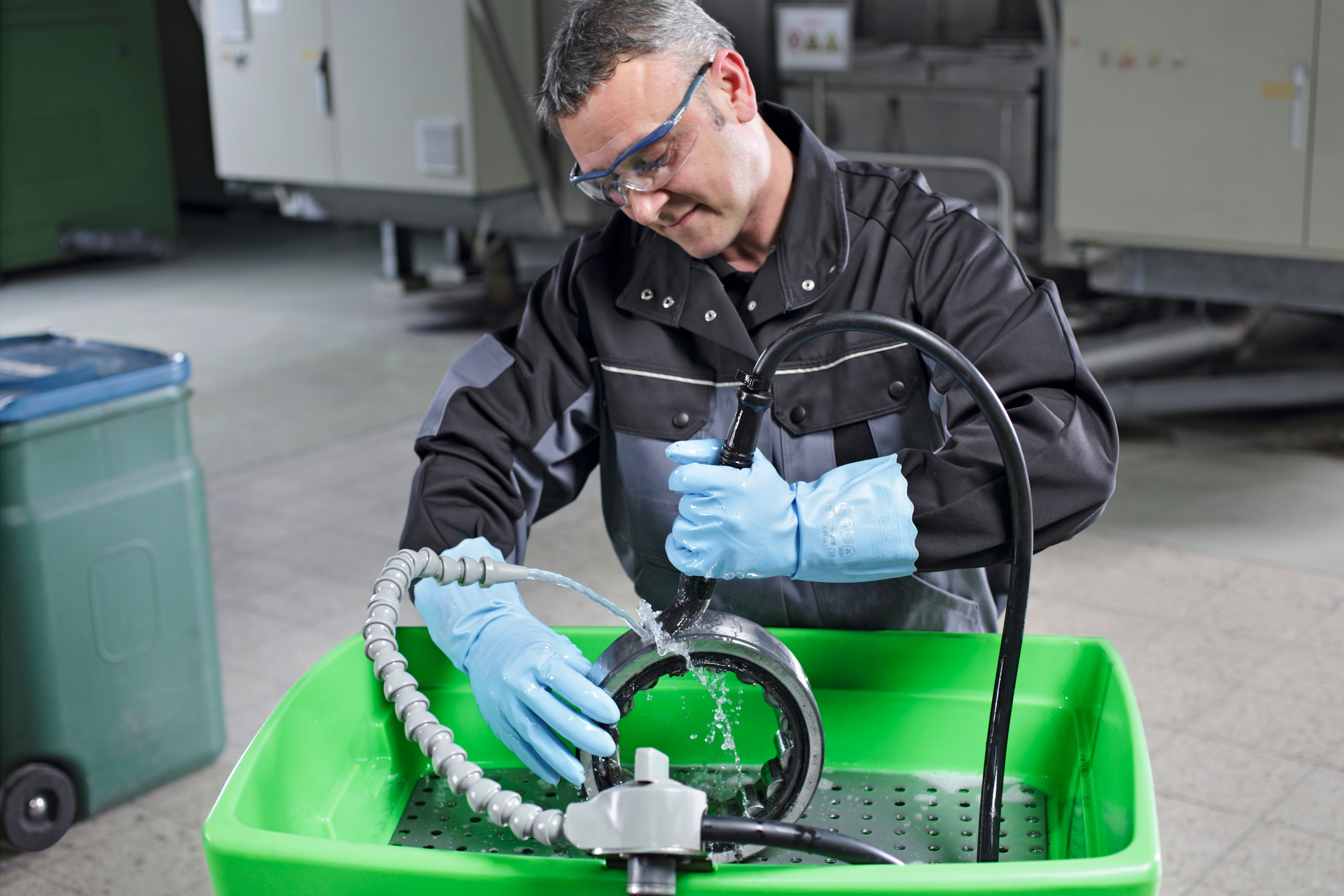 A differenza dei tradizionali detergenti a freddo a base di sostanze chimiche, che spesso producono emissioni COV e rappresentano un rischio per la salute, le lavapezzi Mewa utilizzano un liquido detergente a base d'acqua, completamente privo di etichettatura. E questo significa, in sintesi, che non c'è alcun rischio per la salute o di incendio. Rispetto ai detergenti a freddo, questo liquido può essere utilizzato molto più a lungo senza comprometterne la qualità. Ciò consente di risparmiare e, allo stesso tempo, di utilizzare una soluzione molto più sostenibile in una fase operativa importante. Il liquido contiene una combinazione di agenti sgrassanti e microrganismi. I microrganismi biodegradano il grasso e l'olio in modo totalmente naturale. Questa soluzione sostenibile offre eccellenti prestazioni in termini di pulizia, ovunque si tratti di rimuovere grasso, residui di olio, sali, polvere o trucioli.